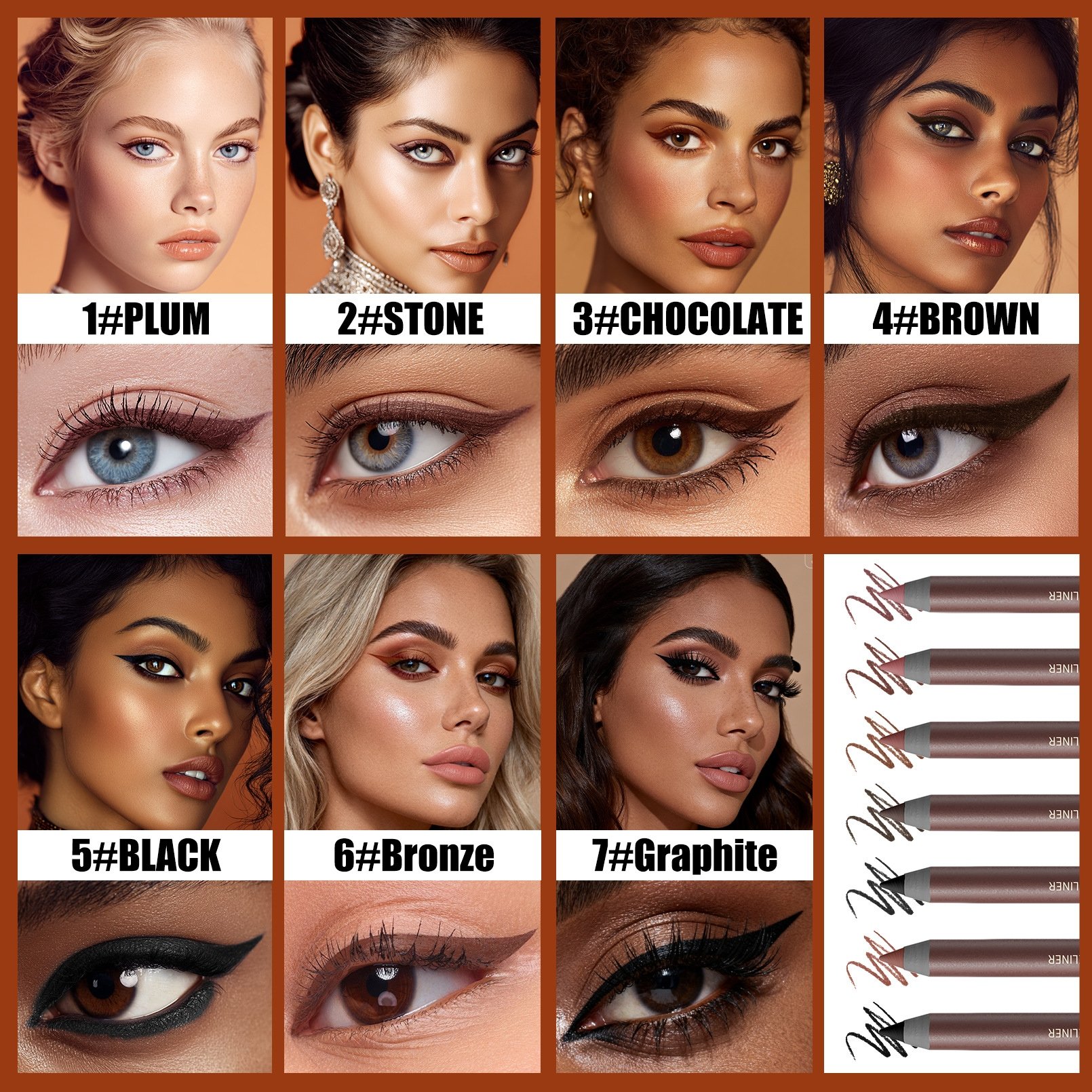 【7 Color Options】This eyeliner set includes 7 colors: Plum,Stone,Chocolate,Bronze,Graphite,Brown,and Black.Perfect for matching different hair colors and creating looks from natural daytime makeup to dramatic evening styles,it's will be your first choice.